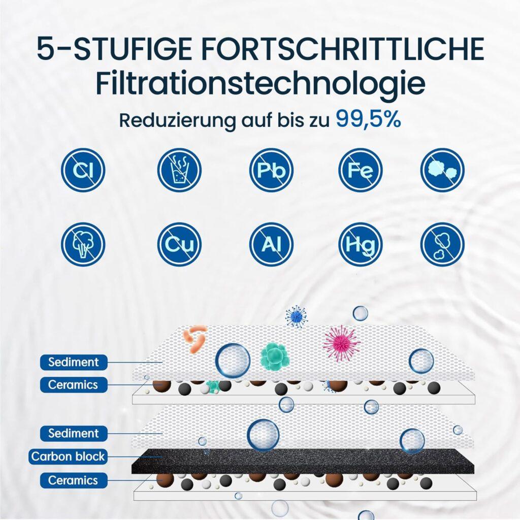 Dieses Untertischsystem beinhaltet Sediment, Alkalikugel, Kohleblock, Mineralkugelkeramik, KDF und Polyphosphat. Es wird mit 2 Filtern geliefert und bietet eine 5-stufige Tiefenfiltration zur Reduzierung von Chlor, Rost, Staub, schlechtem Geschmack, Geruch, Schwermetallen usw.