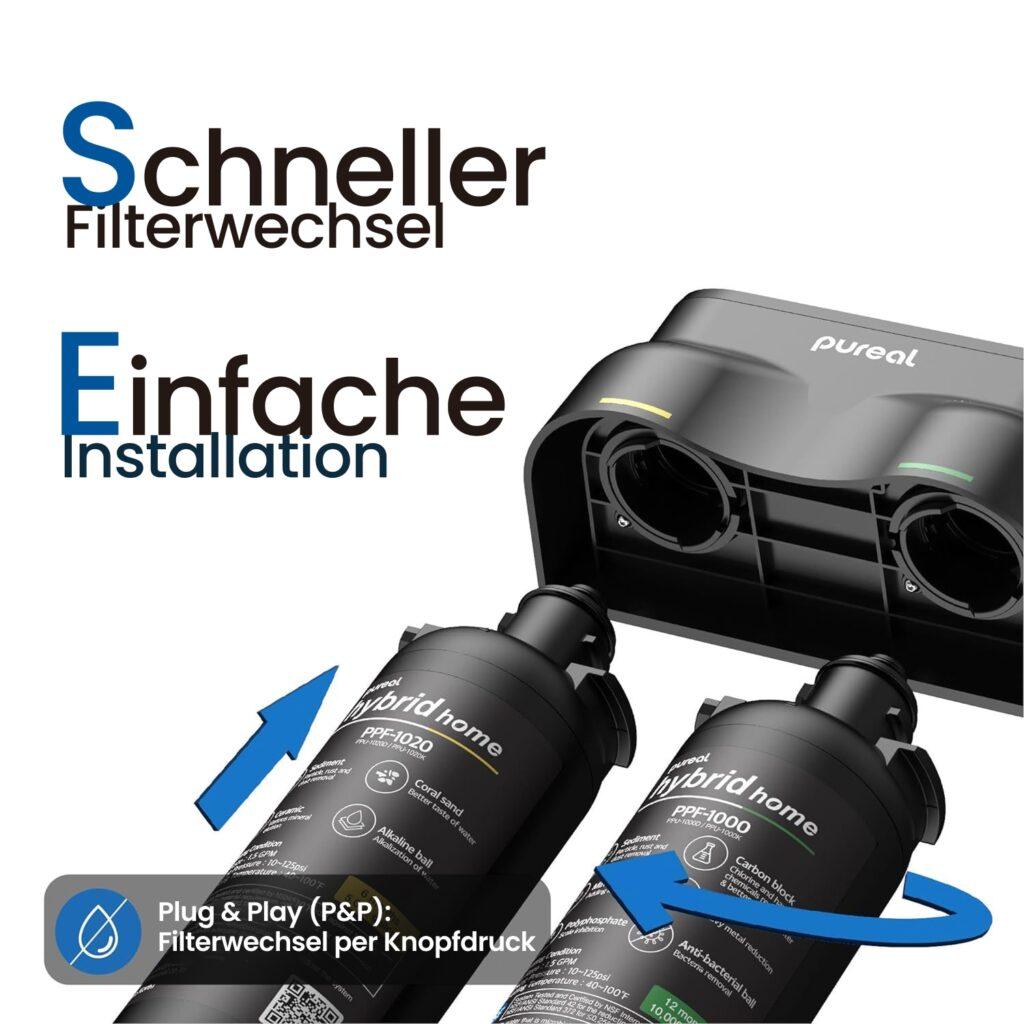 Lange Lebensdauer und Kostenersparnis – PPF-1020 (1. Filter) hat eine Kapazität von 18 000 Litern. Und PPF-1000 (2. Filter) hat eine Kapazität von 36 000 Litern. Dieses System mit hoher Kapazität kann 1 Jahr lang verwendet werden. Je nach Installationsumgebung empfiehlt sich ein früherer Wechsel, um eine bessere Filterung zu erreichen.